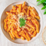 The authentic taste of Italy is achieved with our chicken in tomato sauce and penne pasta. This dish features freshly cooked penne pasta, perfectly al dente, paired with a homemade traditional Italian tomato sauce rich in flavour and blended with a medley of vegetables.